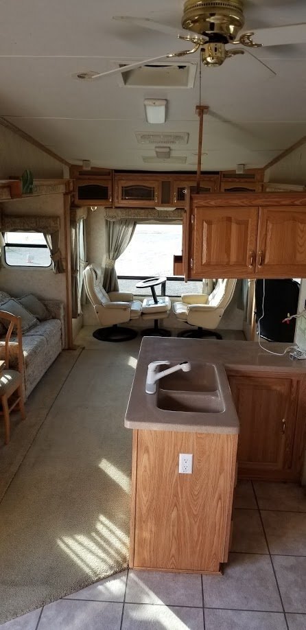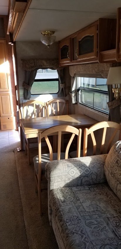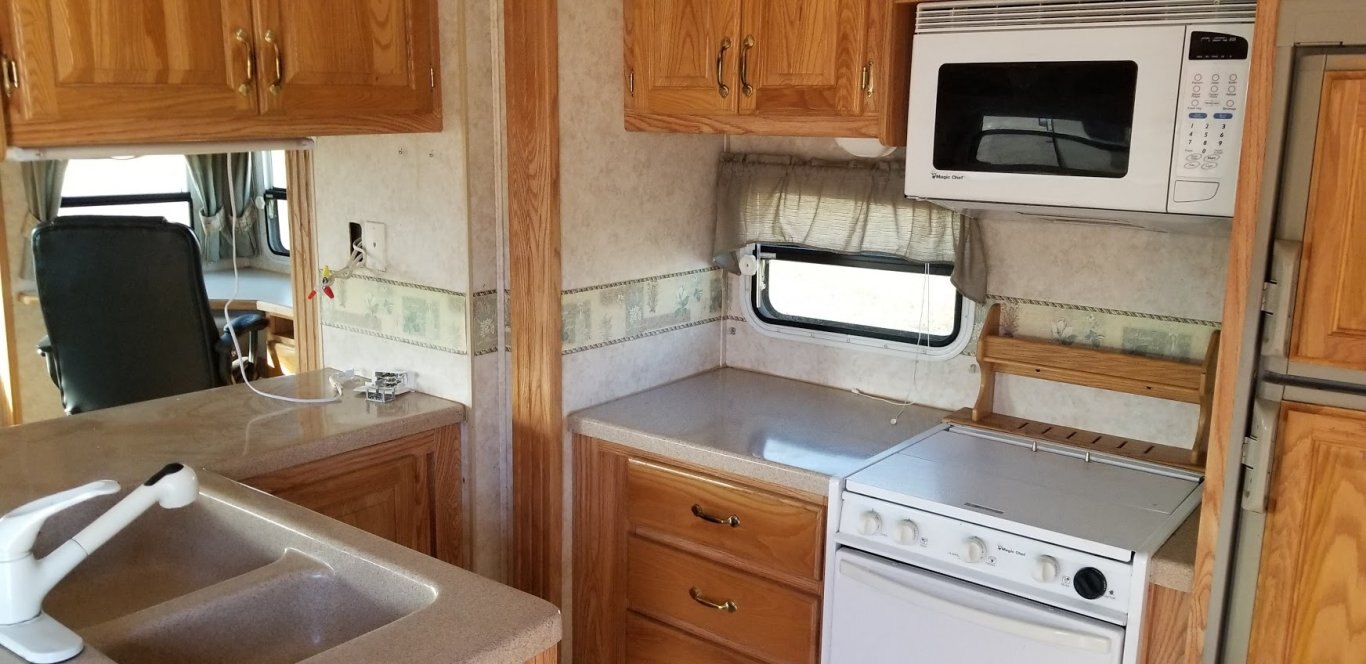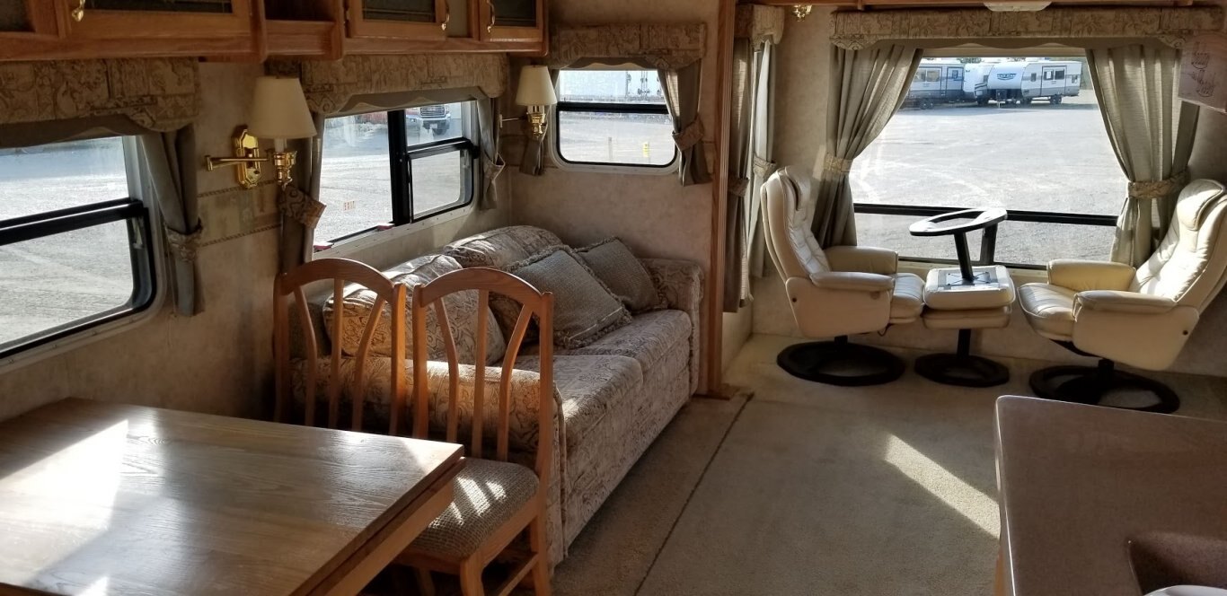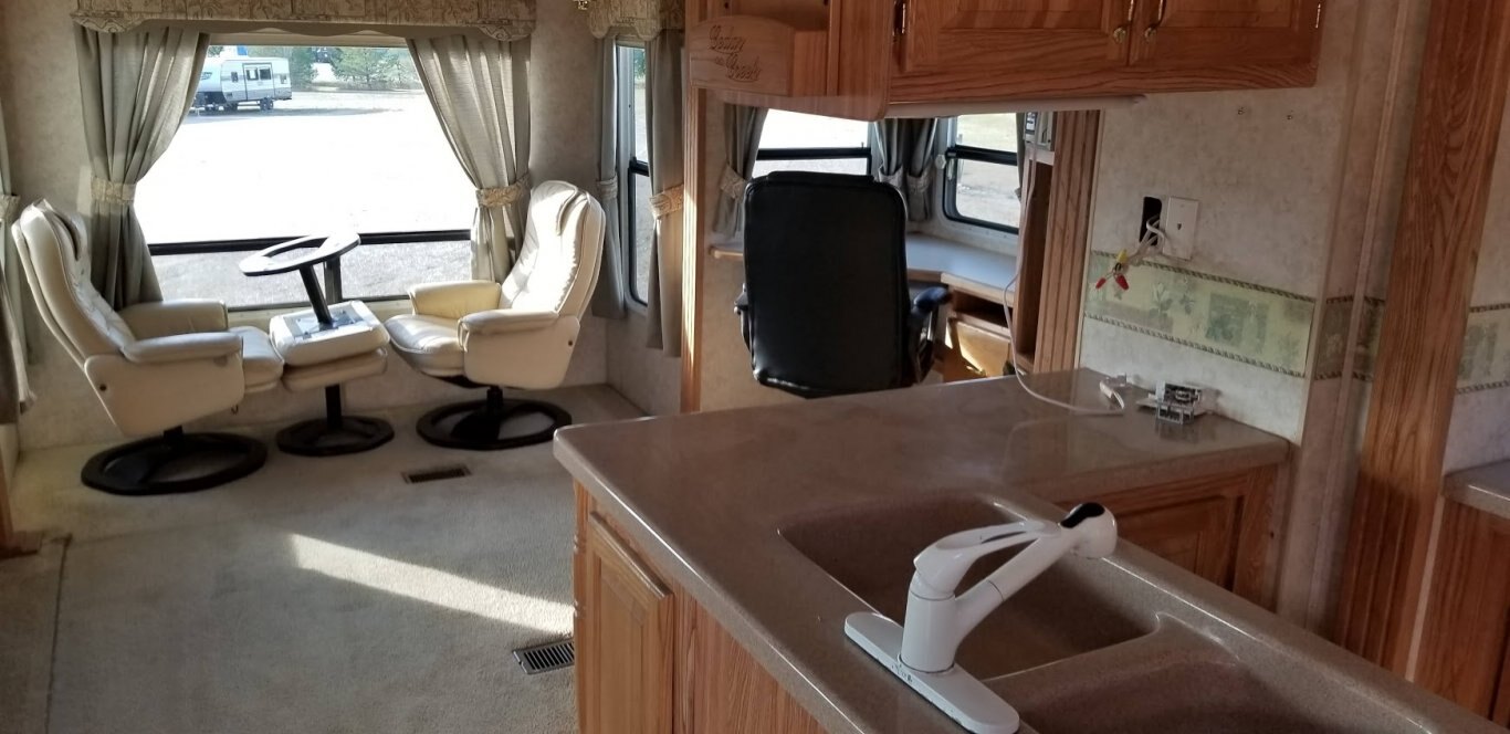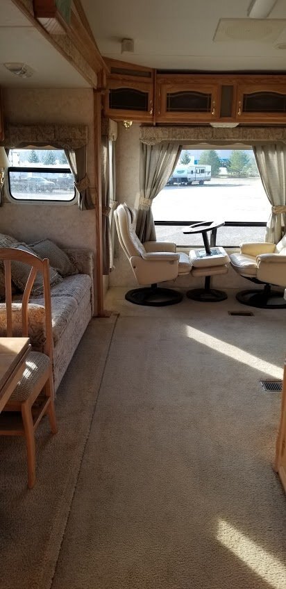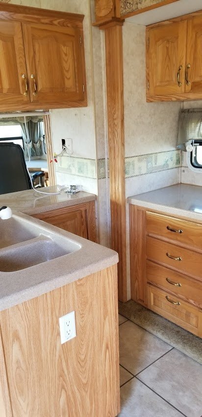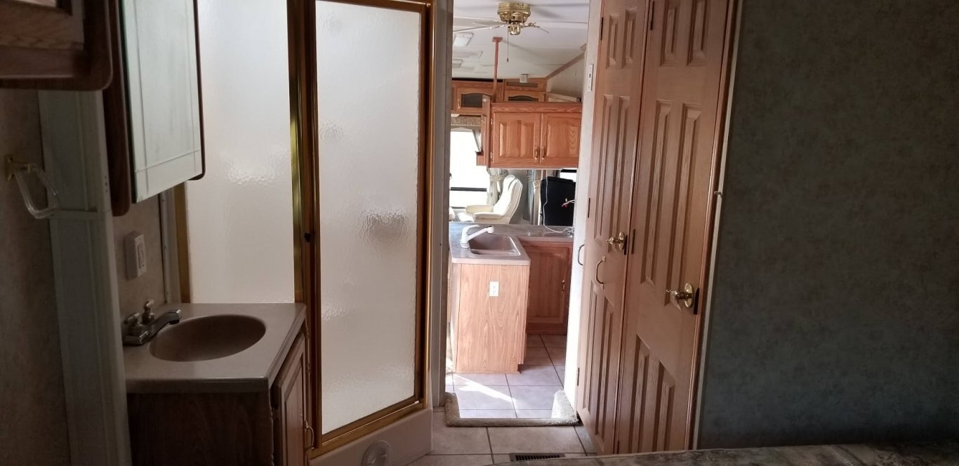 Gel coat exterior fibreglass. 4 (four!) power slideouts, privacy glass windows with side profile skylight, true hardwood cabinets with glass inserts, solid surface countertops, upgraded glass shower surround. Lazy Susan and pre plumbed for washer dryer