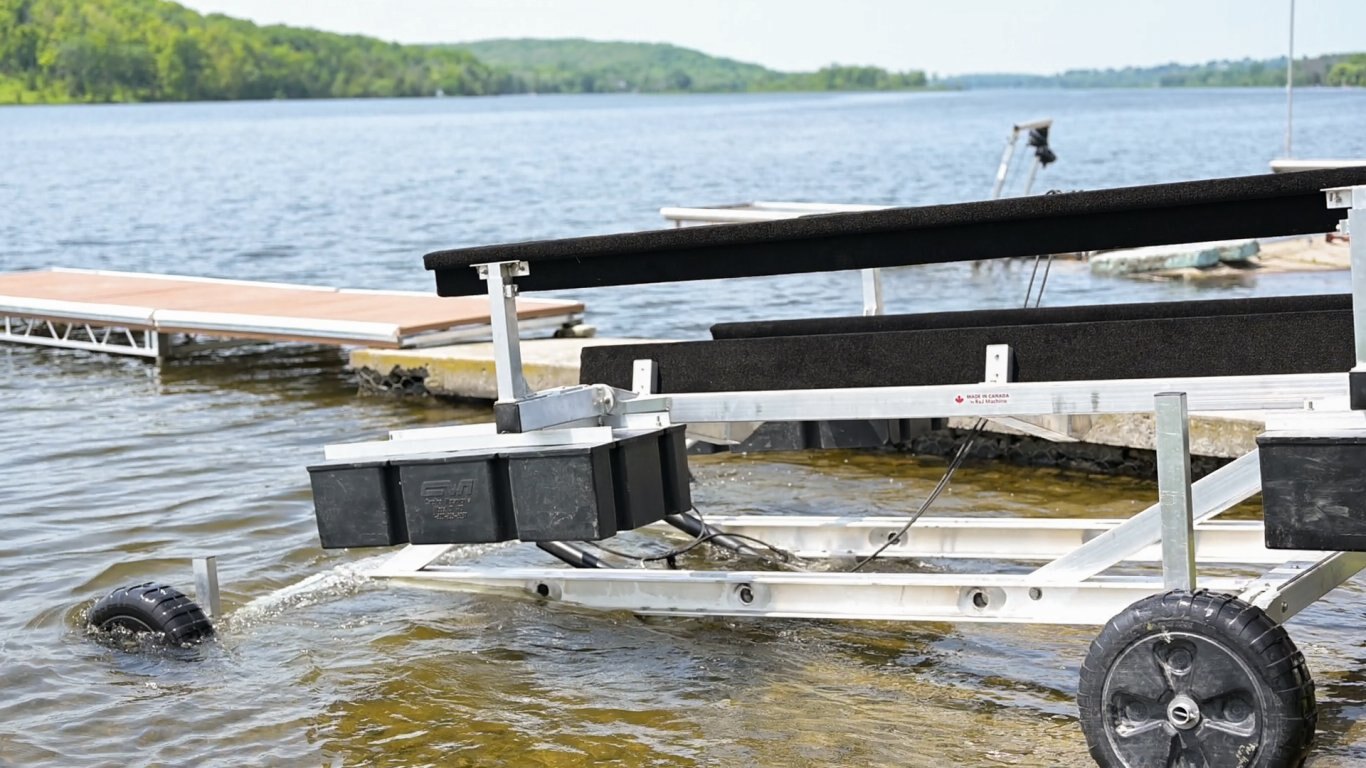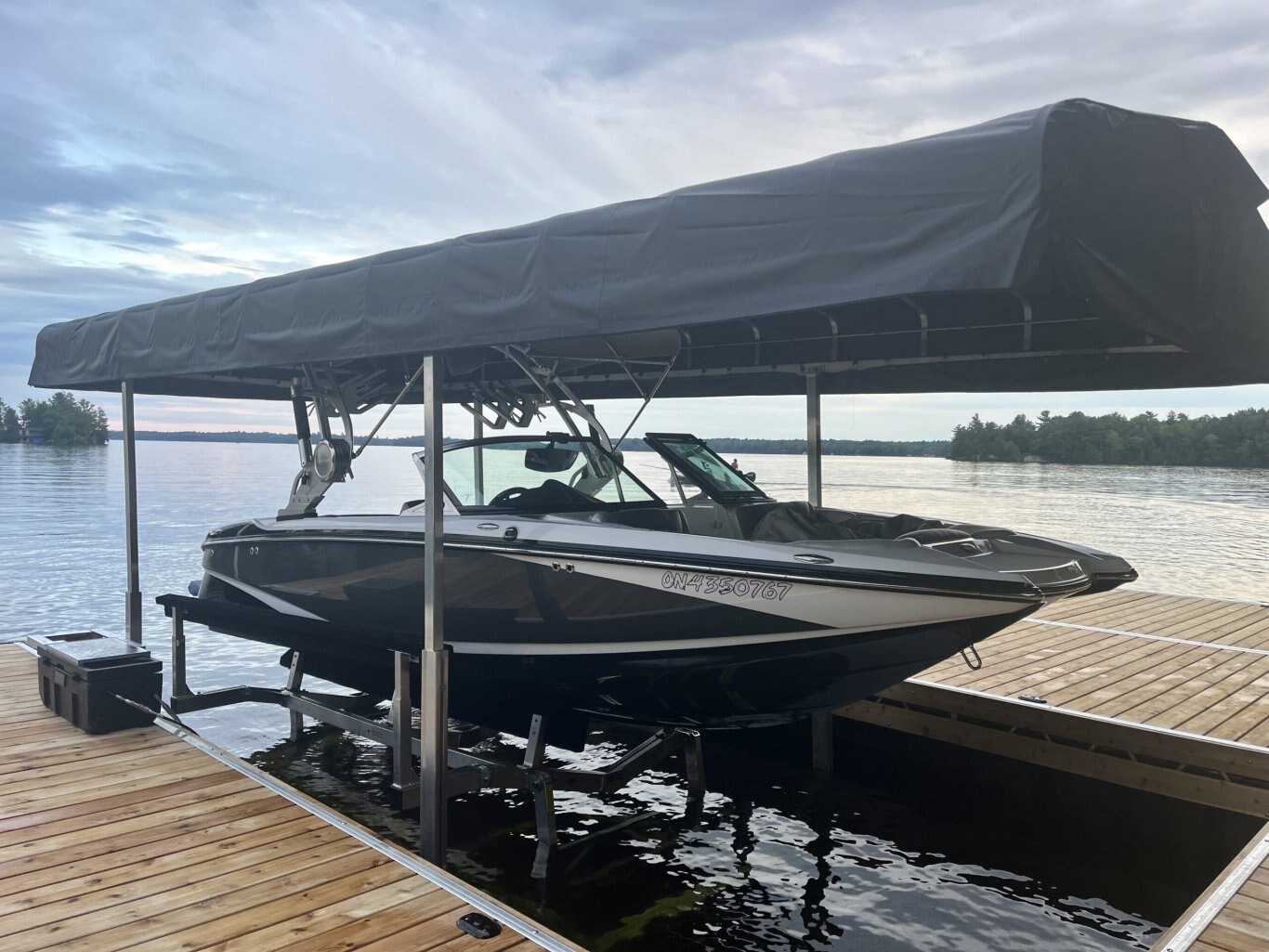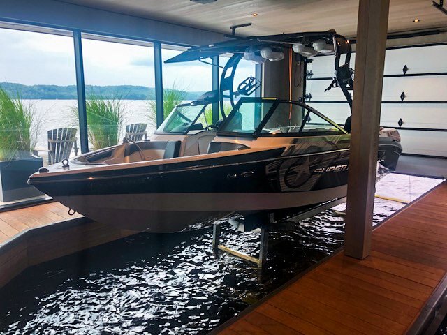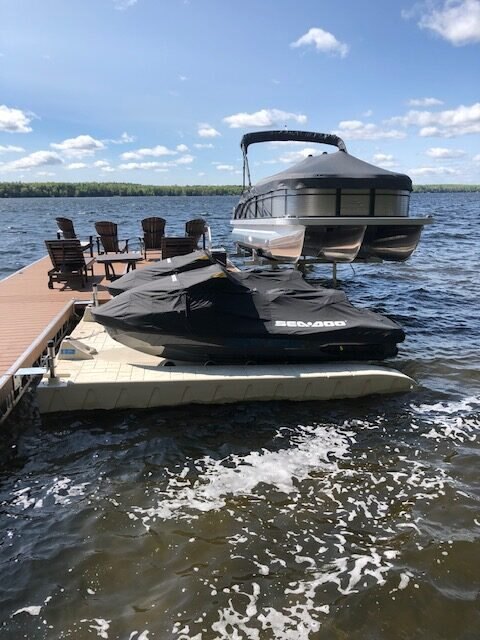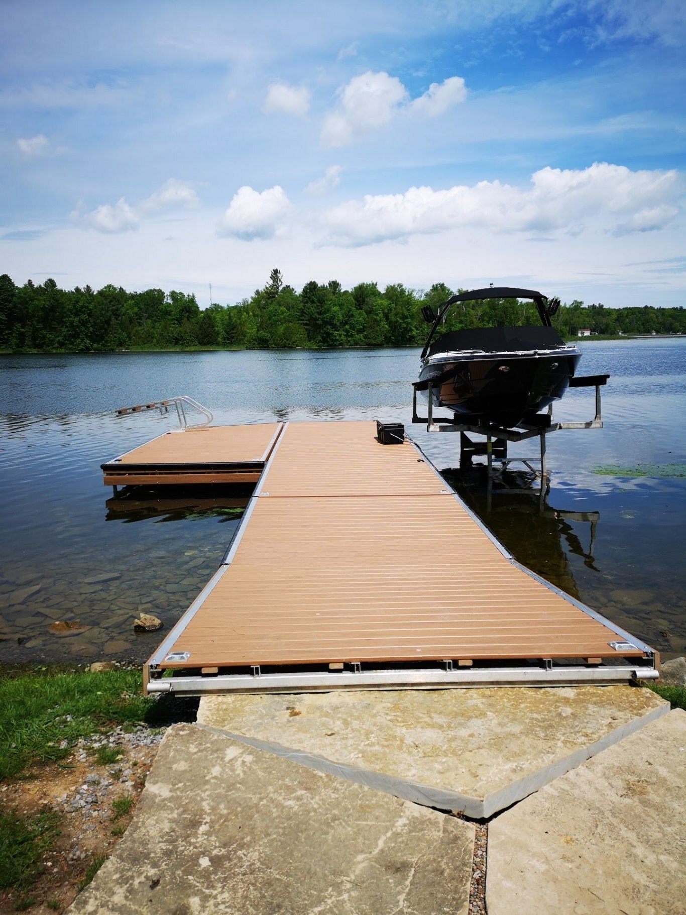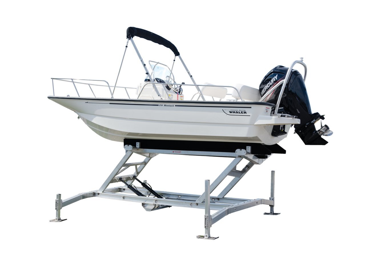 | Our Hydraulic Boat Lifts have incorporated the latest in technology. The hydraulic system will quietly and quickly remove your boat from the water. All pivot points on the bed have bronze bushings and stainless steel lift pins. Our hydraulic cylinders are filled with biodegradeable fluid to protect the environment should a seal or hydraulic line ever fail. Our hydraulic rams are specially coated to provide long life in a harsh marine environment. We use special double lip seals to keep water out while keeping the hydraulic fluid in. Our up and down movement is controlled by a push button remote control. The entire system runs by a 12 volt battery. A solar panel on the top of the dock helps to keep your battery charged. |