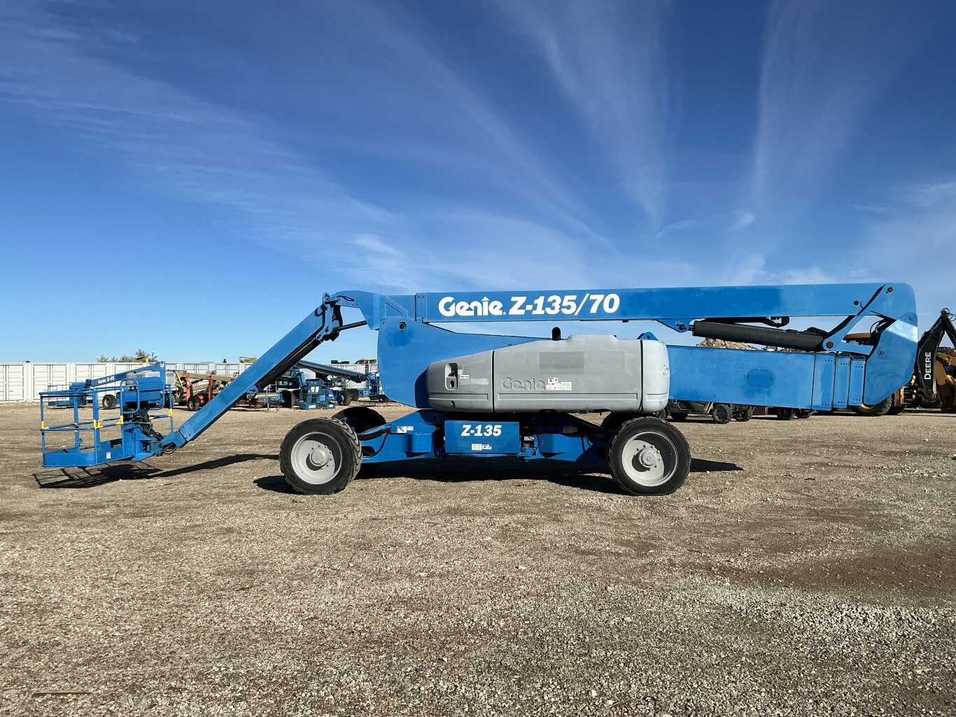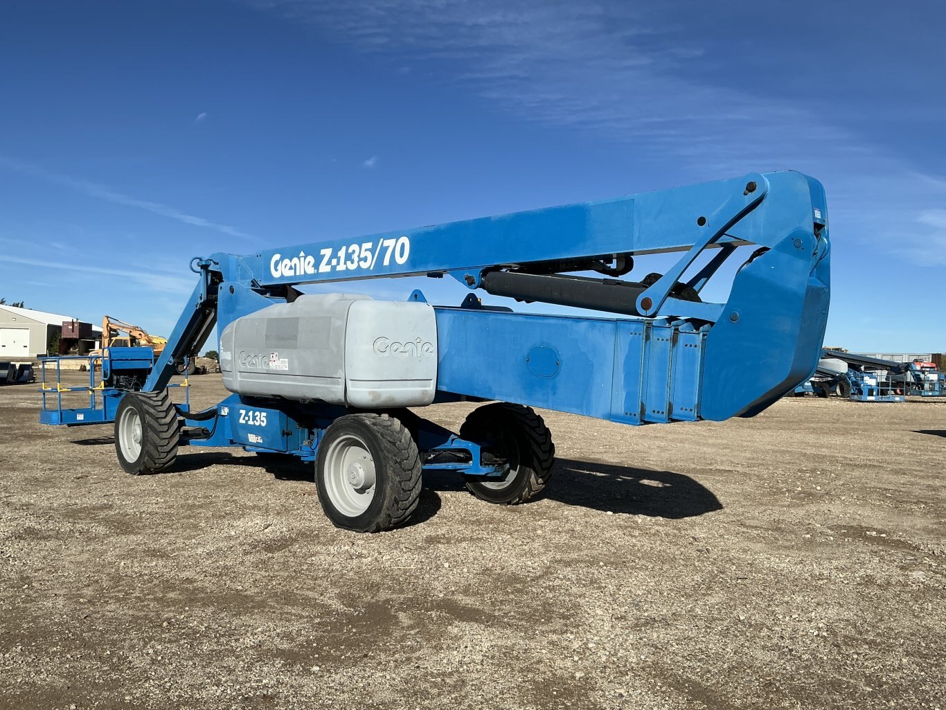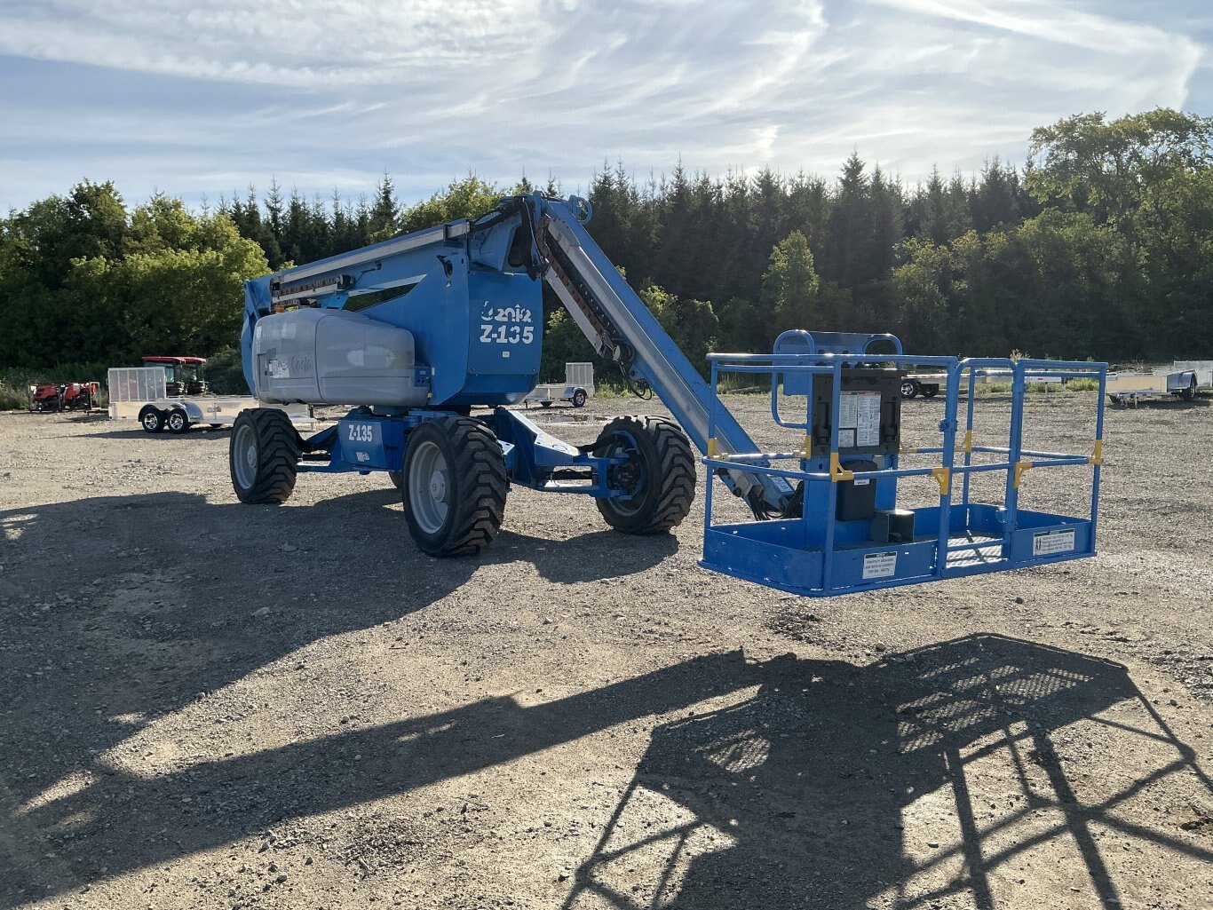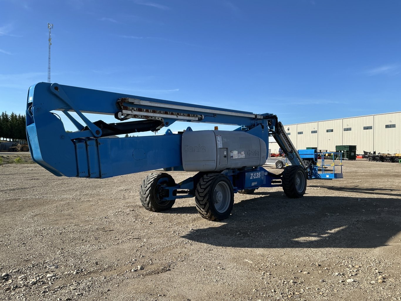Articulating man lift, 2012 Genie model Z135/80. This boom lift has a platform height of 135 feet giving 141 feet working height and 69 feet outreach. 4WD driveline and powered by a Perkins diesel engine. Machine weighs around 45000 lbs. Hour meter shows 4004