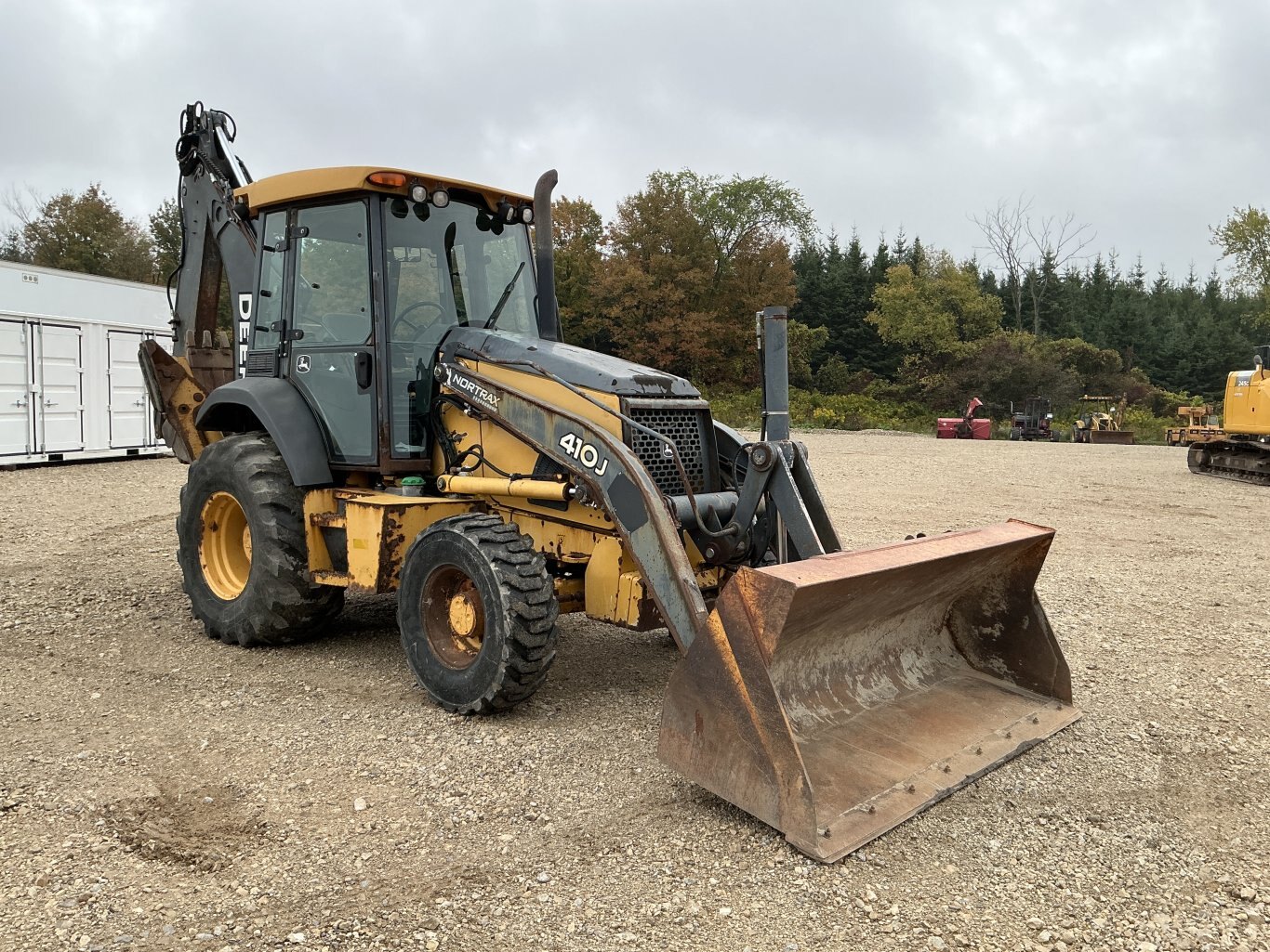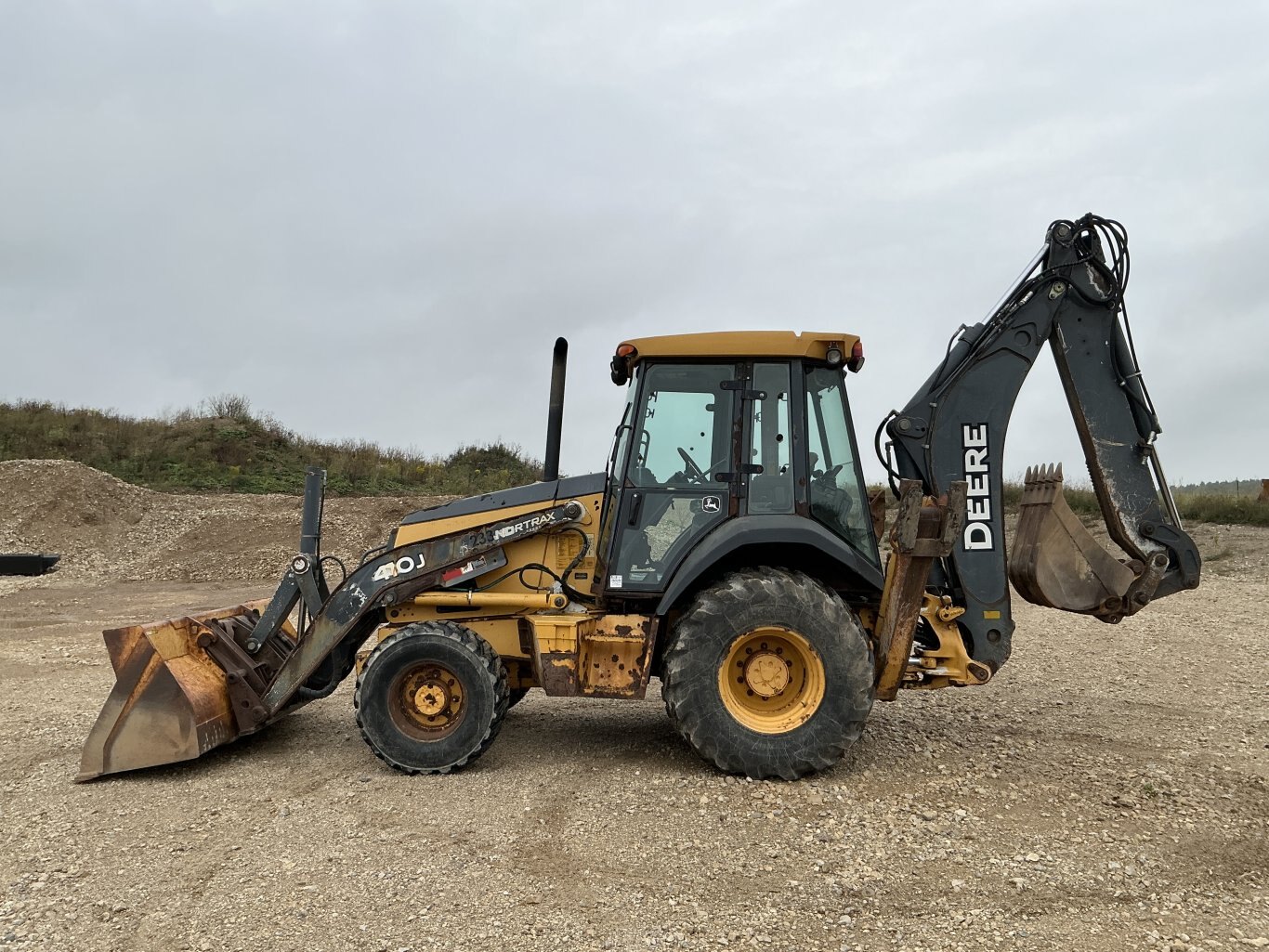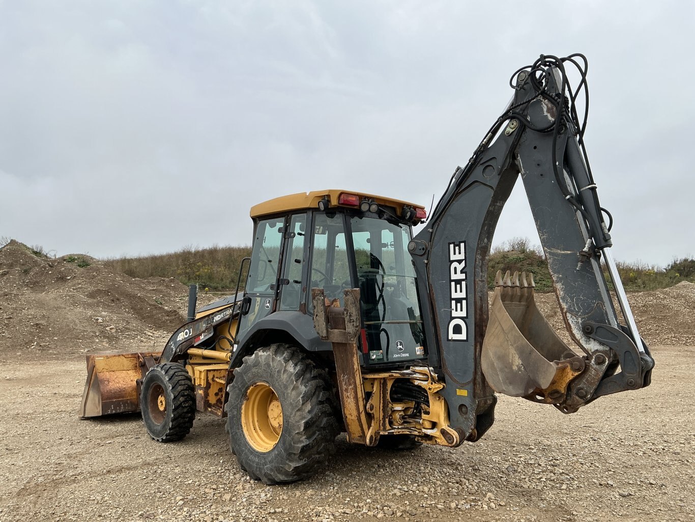 2010 John Deere 410J is powered by a 98hp John Deere diesel engine. Unit is equipped with front hydraulic quick connect. Enclosed heated cab with all glass intact and a c. 4 wheel drive with 4 speed transmission. Unit is extendahoe with pilot controls. Machine is equipped with rear auxiliary hydraulics with manual pin coupler. Operating weight is about 20,500lbs. Hour meter reads 15226.