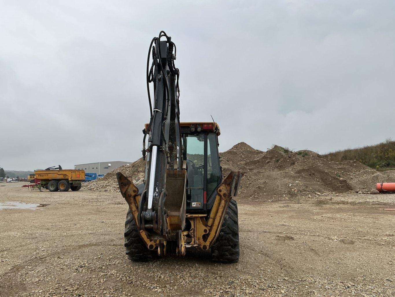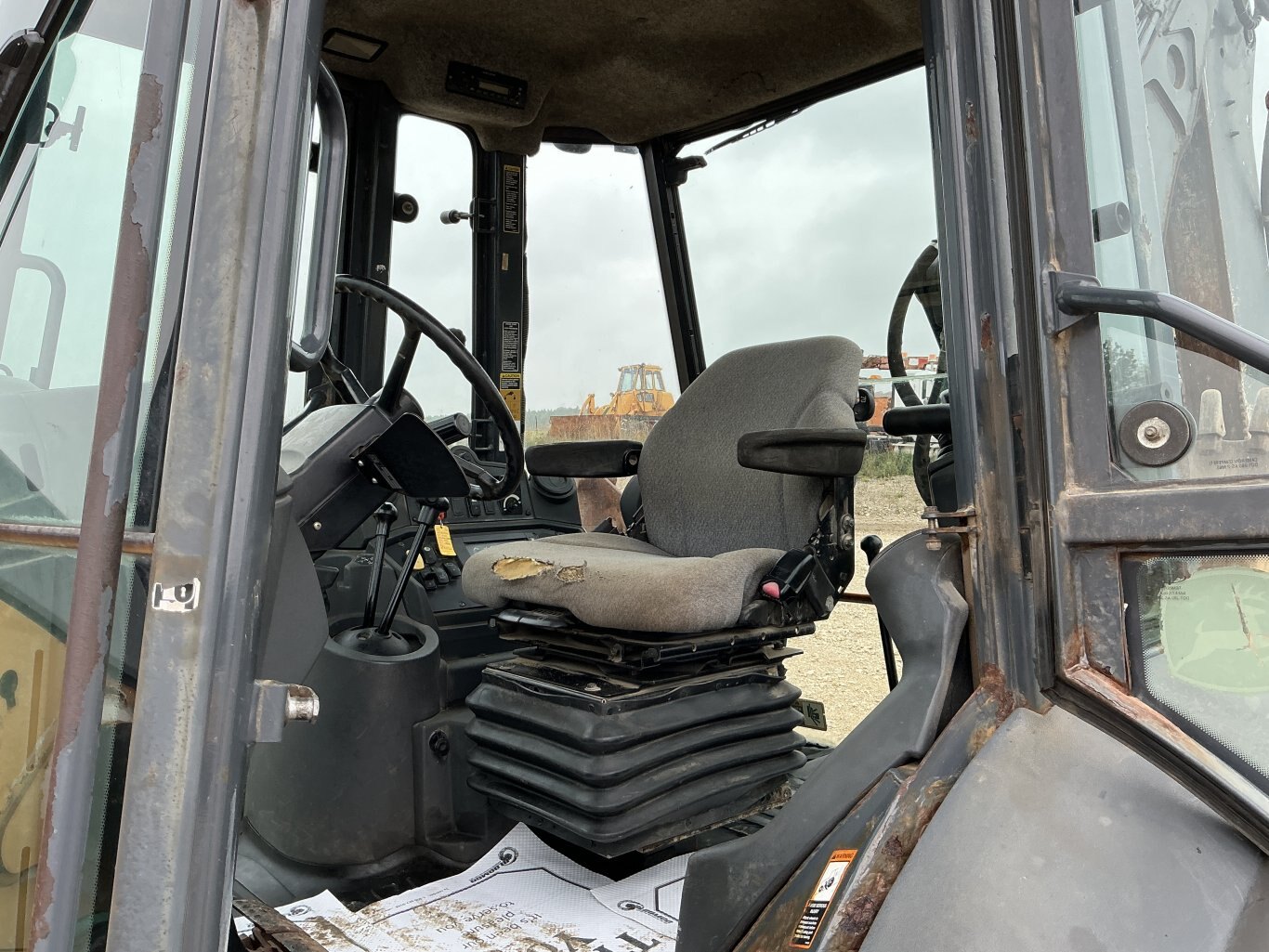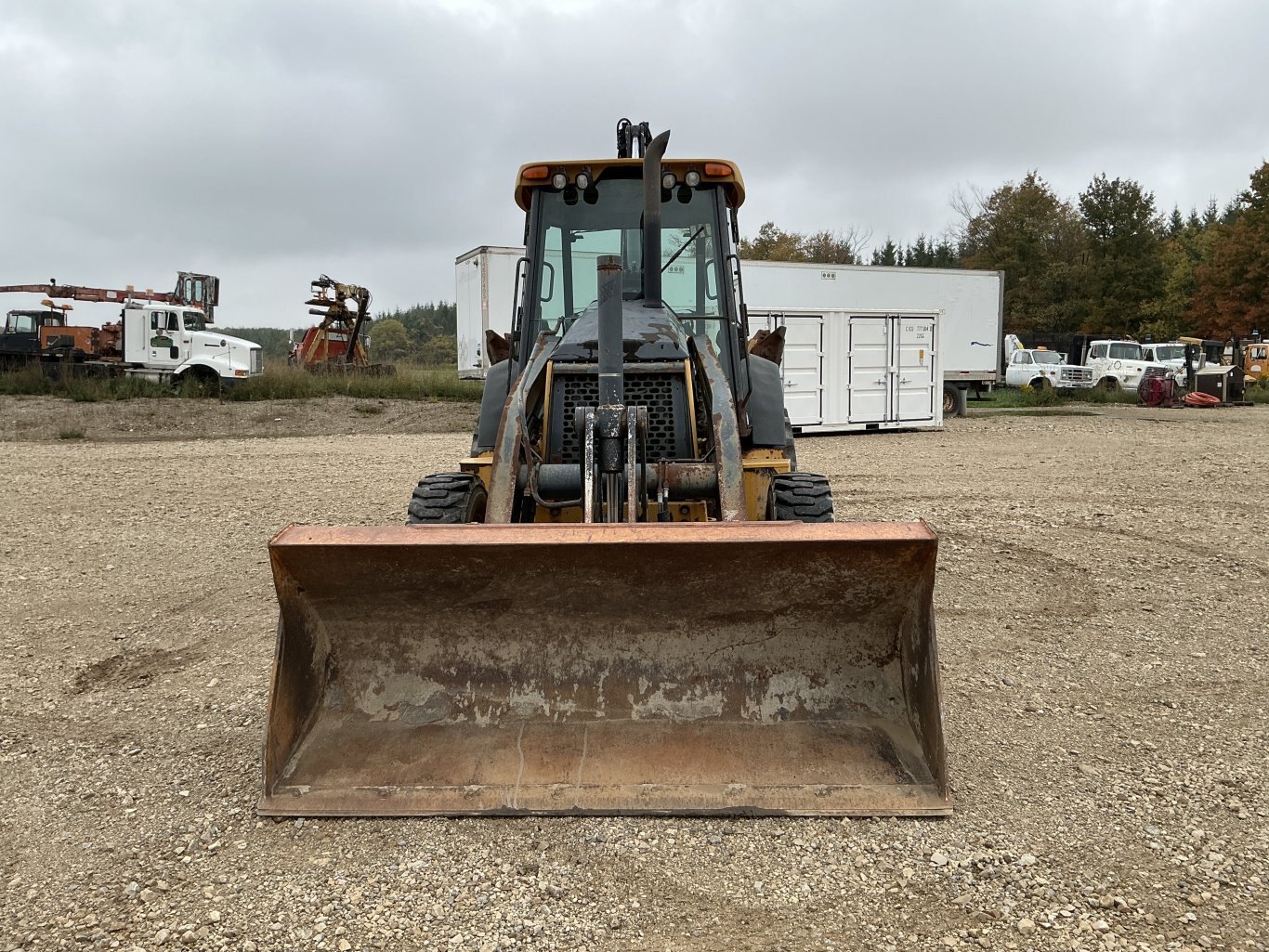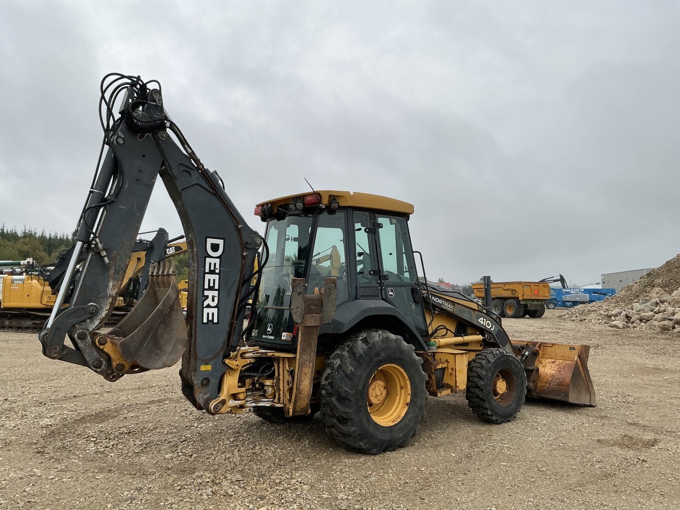 2010 John Deere 410J is powered by a 98hp John Deere diesel engine. Unit is equipped with front hydraulic quick connect. Enclosed heated cab with all glass intact and a c. 4 wheel drive with 4 speed transmission. Unit is extendahoe with pilot controls. Machine is equipped with rear auxiliary hydraulics with manual pin coupler. Operating weight is about 20,500lbs. Hour meter reads 15226.