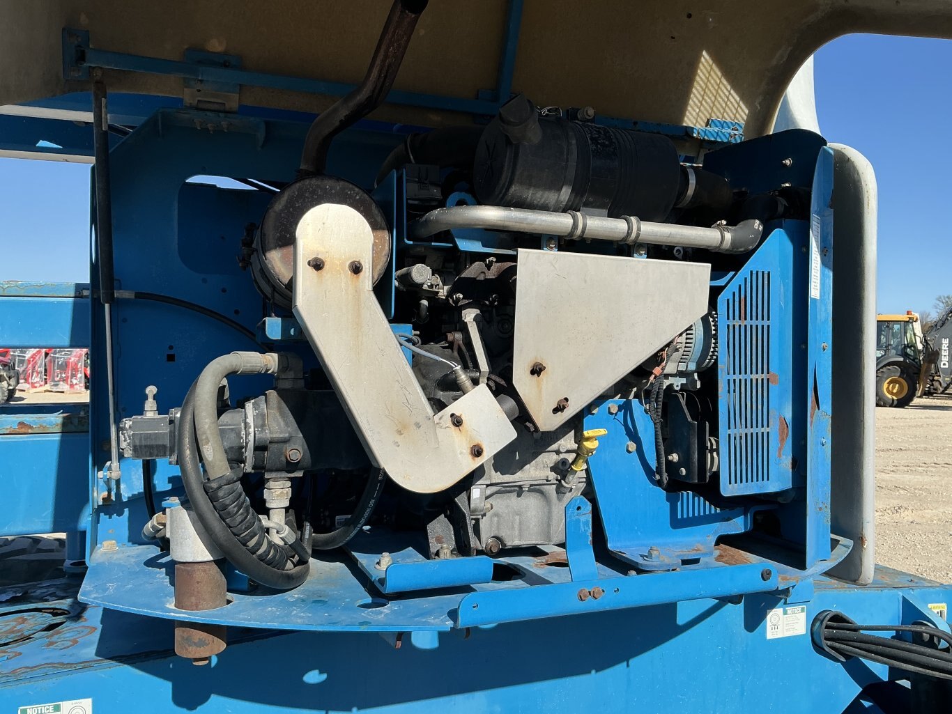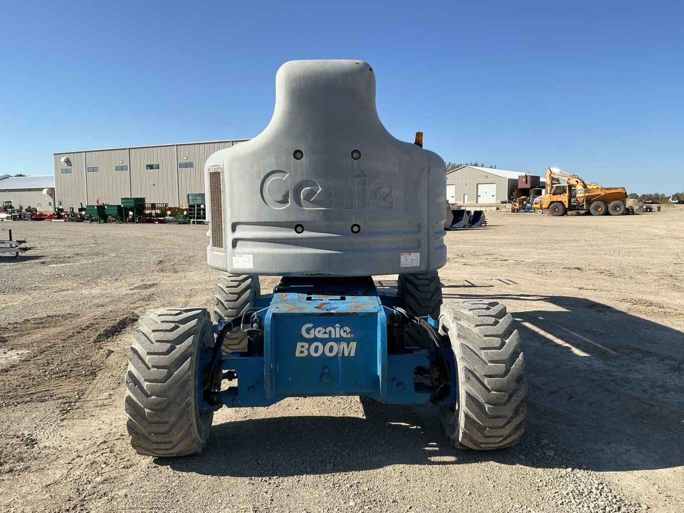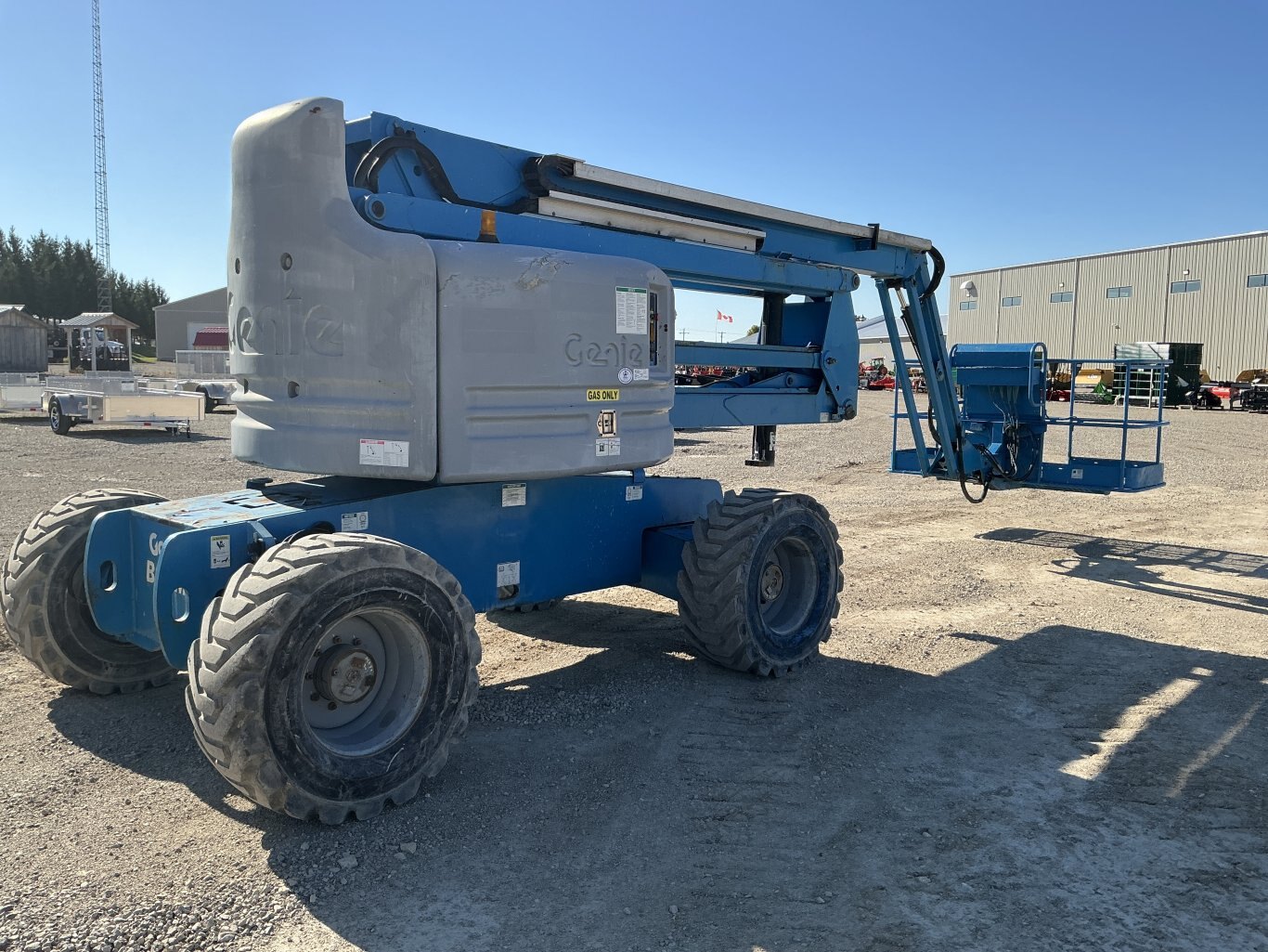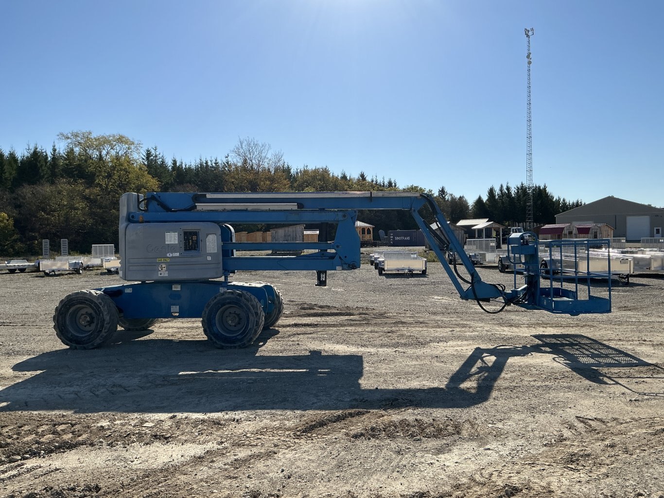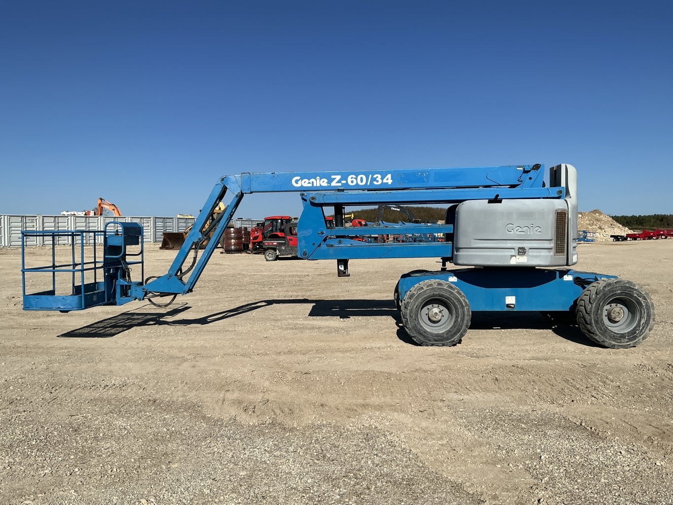 Articulating man lift, 2007 Genie model Z60/34. This boom lift has a platform height of 60 feet giving 66 feet working height and 36 feet outreach. 4WD driveline and powered by a Ford gas engine. Machine weighs around 22,000 lbs. Hour meter shows 4779.