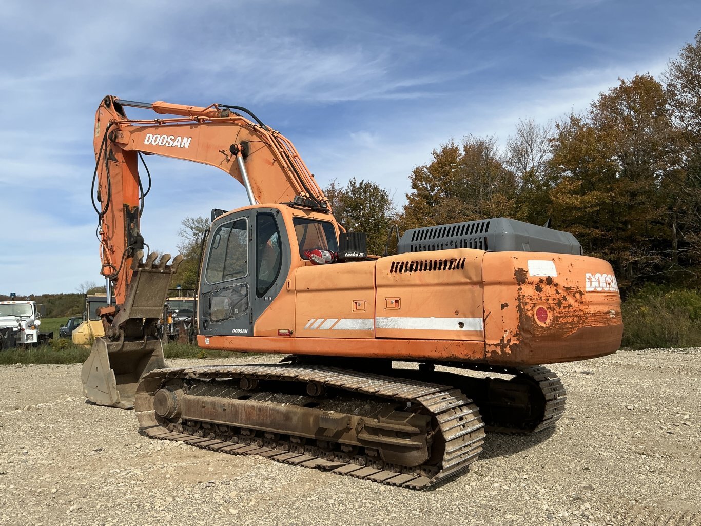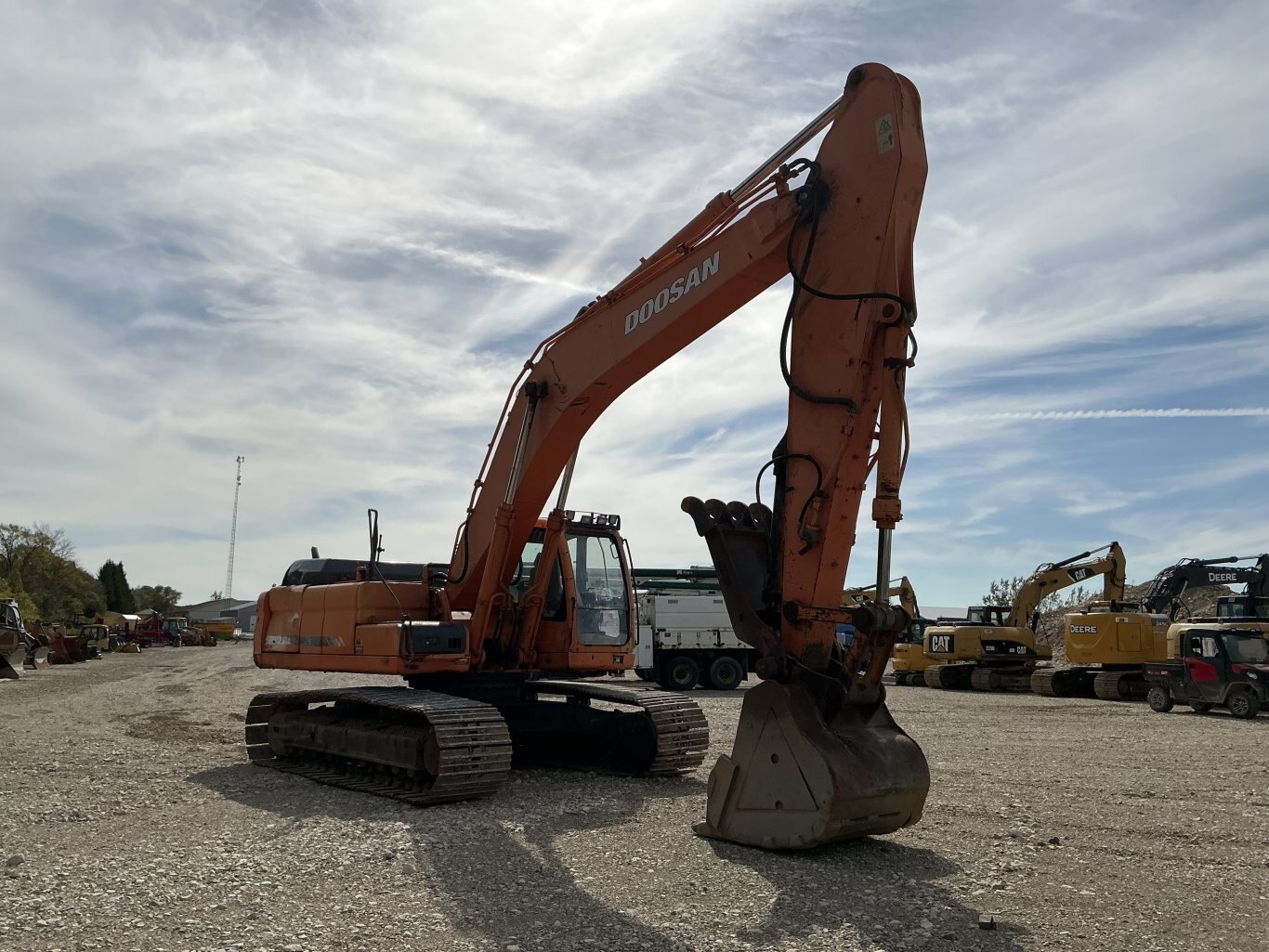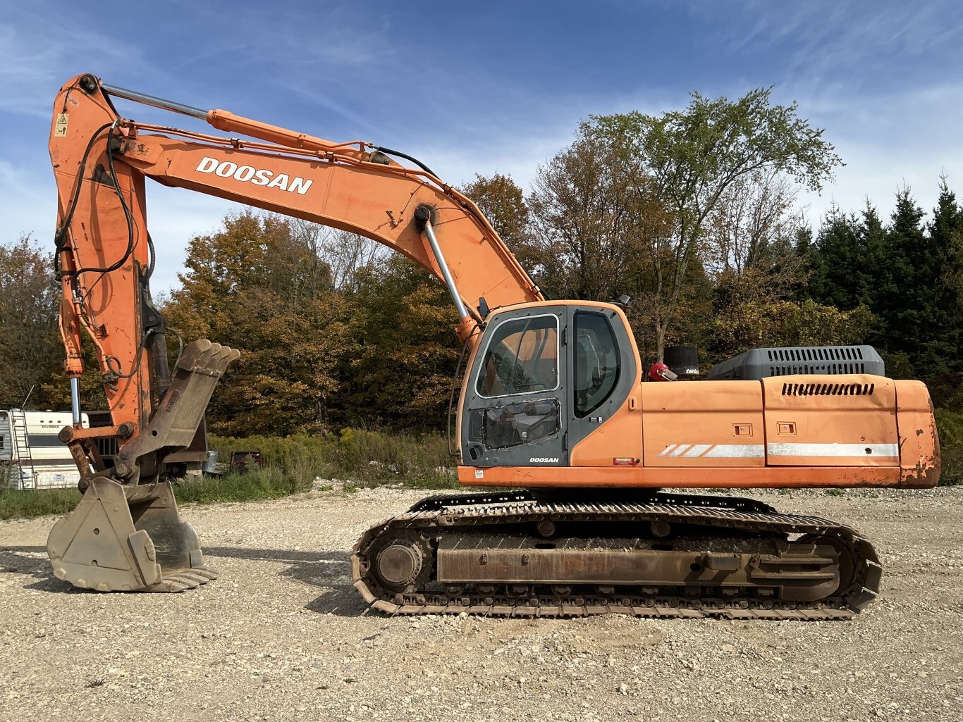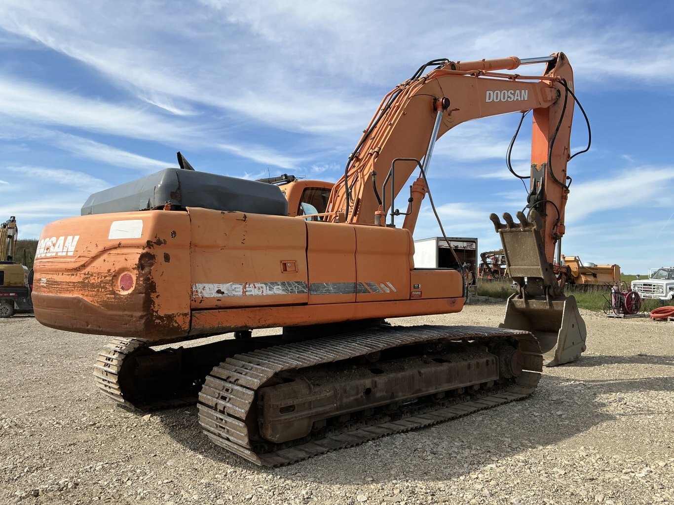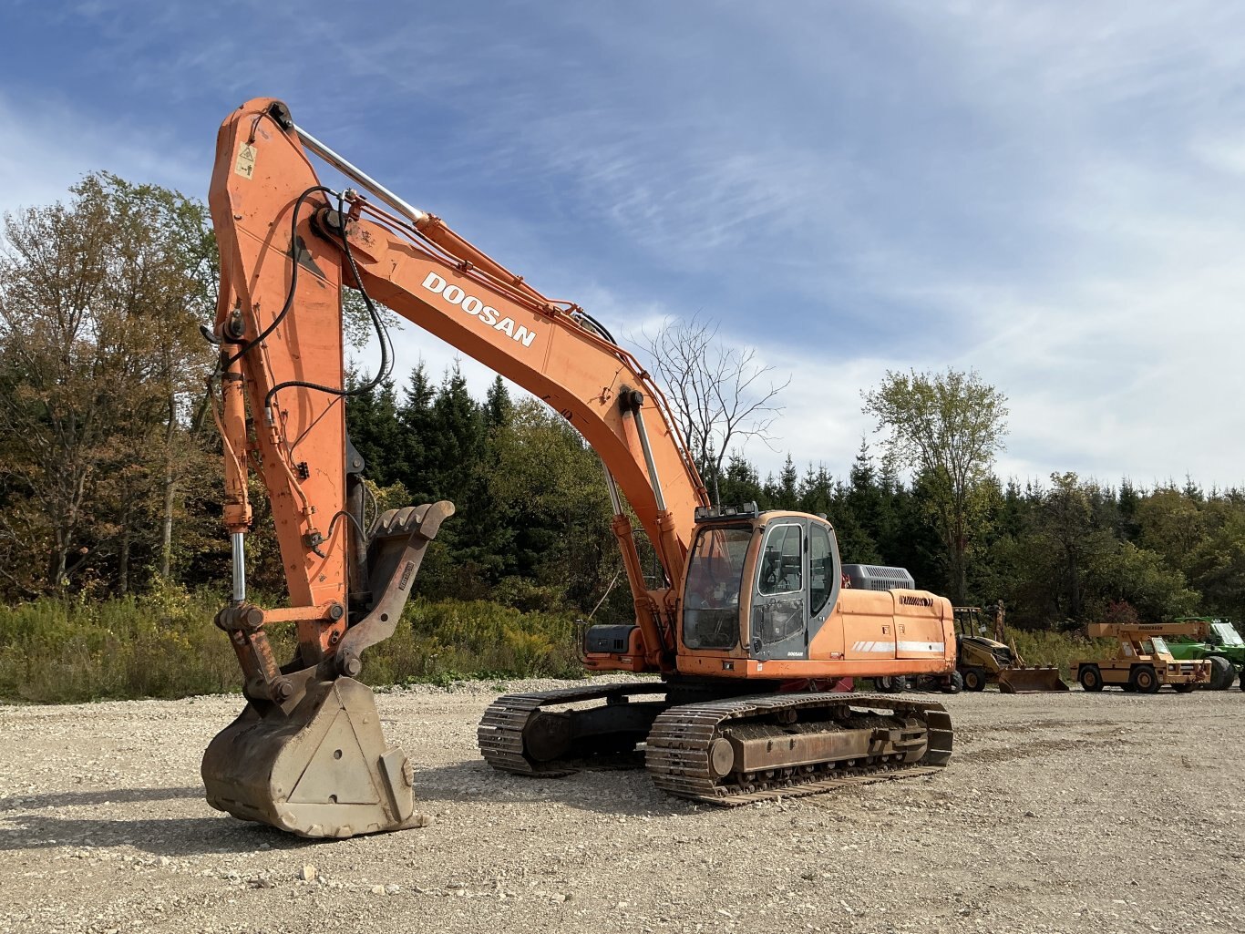2011 Doosan DX350LC is powered 281hp Doosan diesel engine. Machine weighs about 78,000lbs. Enclosed cab with all glass intact. Unit is equipped with hydraulic thumb and auxiliary plumbing. Comes with one tooth bucket. Hours unkown.