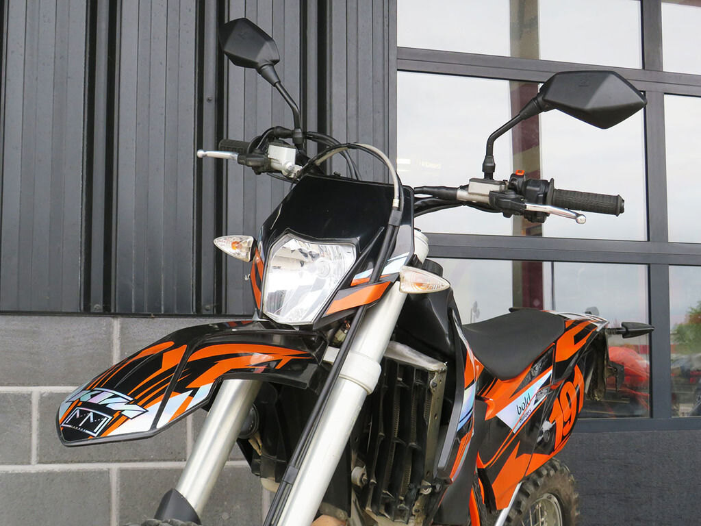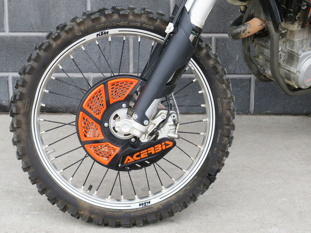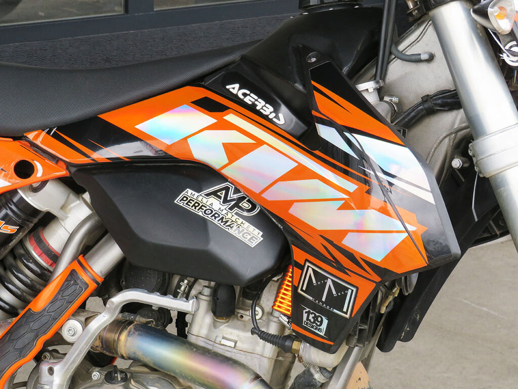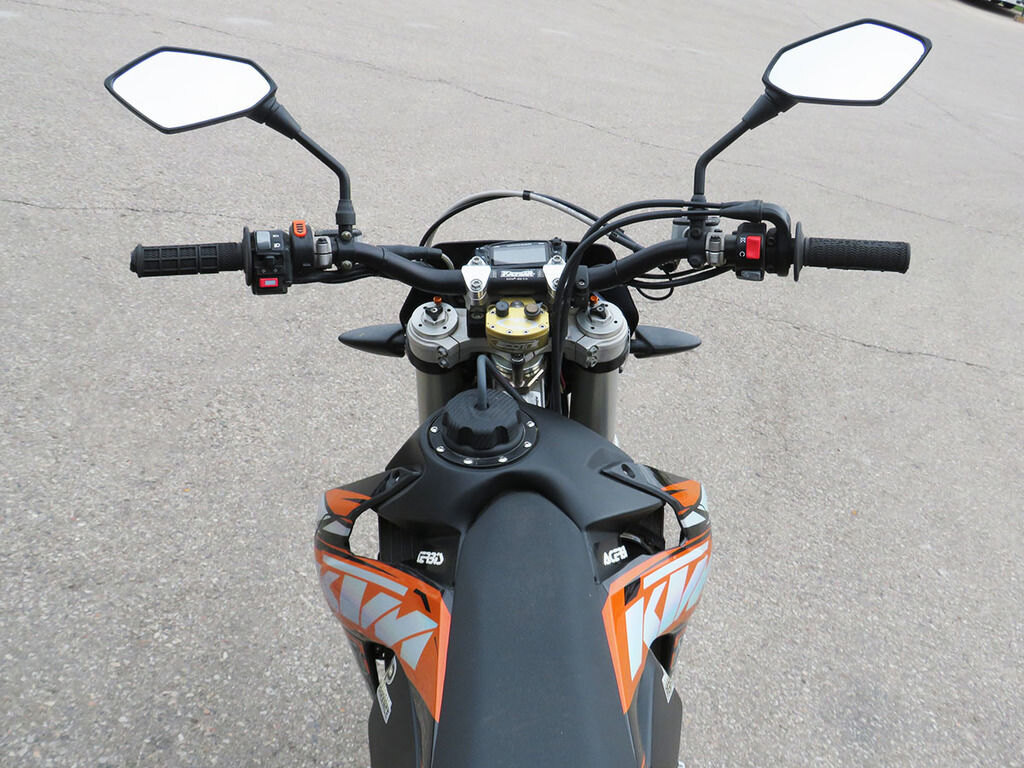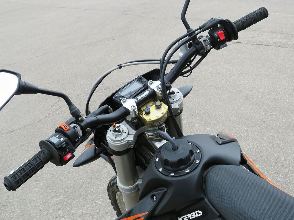 KTM's iconic street-legal enduro loaded with add-ons. Featuring a full Akrapovic exhaust, Rekluse clutch, Acerbis oversized fuel tank, frame guards, and front brake guard, a handlebar-mounted map switch that allows you to switch from stock / mild / or wild on the fly, Scotts steering damper, Voyager digital gauge, Flo Motorsports footpegs, a custom decal kit, and anodized accents all over!