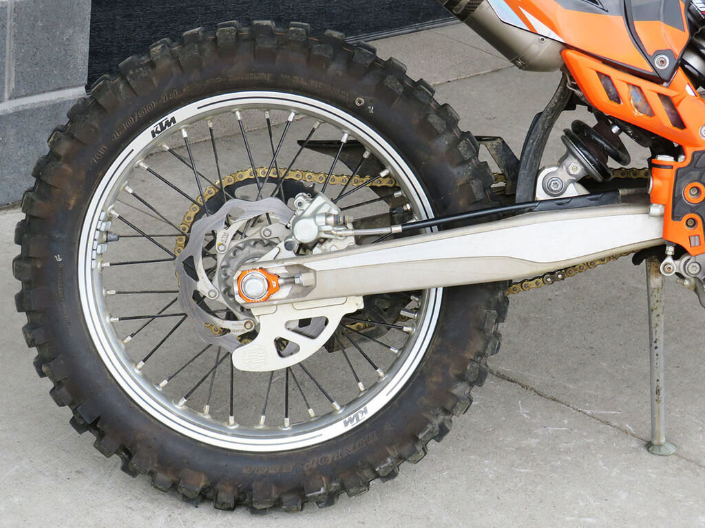 The first rate WP Suspension elements have been further improved for 2014. Specially designed for enduro riding and in some models with an optimized tuning, they ensure maximum traction and plenty of comfort. Of course, compression and rebound damping can be adjusted to the track conditions and the rider's preferences with a twist of the wrist - the rear monoshock has separate high and low speed adjustments.