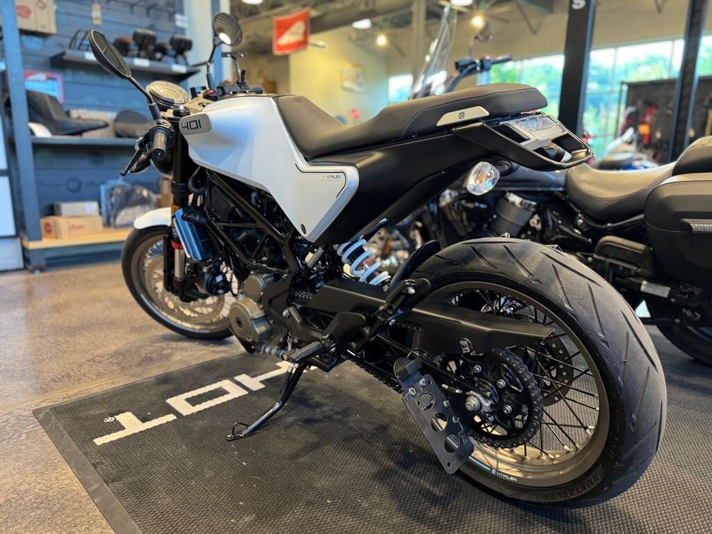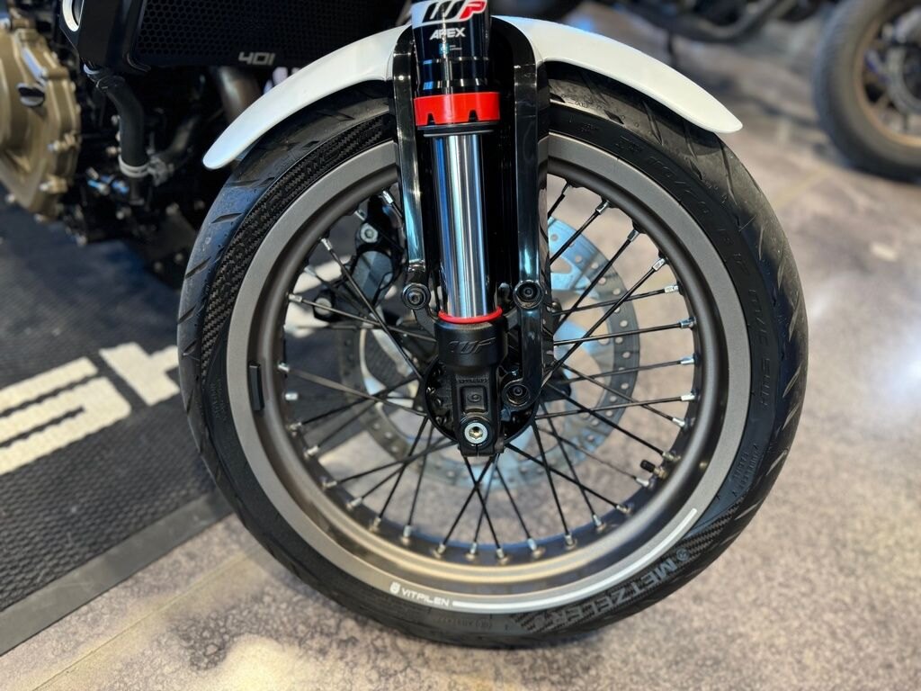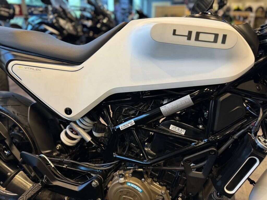 The Vitpilen 401 is fitted with hydraulic ByBre brake callipers, which are manufactured to the highest standards, and in combination with 320mm front and 230mm rear perforated steel discs, deliver controllable and confident braking performance.The Vitpilen 401 is also fitted with a state-of-the-art Bosch ABS system, ensuring the highest level of safety in varying braking conditions.