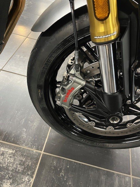 DYNAMICThe all-new RS model takes the Speed Twin 1200’s unique blend of classic character and contemporary capability and adds top-specification chassis components and cutting-edge performance-enhancing technology to the more focused riding position to deliver a modern classic with even sharper responses. The top-specification Marzocchi 43 mm USD forks are fully adjustable, so they can be fully tailored to suit any riding style. At the rear, twin Öhlins piggy-back suspension units provide sublime damping and are also fully adjustable for the perfect set-up. Underlining the Speed Twin 1200 RS’s intentions to be the most capable and sports-focused bike in its class, a Brembo master cylinder is paired to top-of-the-line Stylema calipers for unbeatable braking power and exquisite lever feel. New lightweight aluminum seven-spoke wheels add further to the agility, reducing inertia to speed-up direction changes and reacting instantly to rider inputs. Fitted with superb Metzeler Racetec RR K3 tires, the outstanding handling performance can be fully exploited thanks to the outstanding feel and grip on offer. |