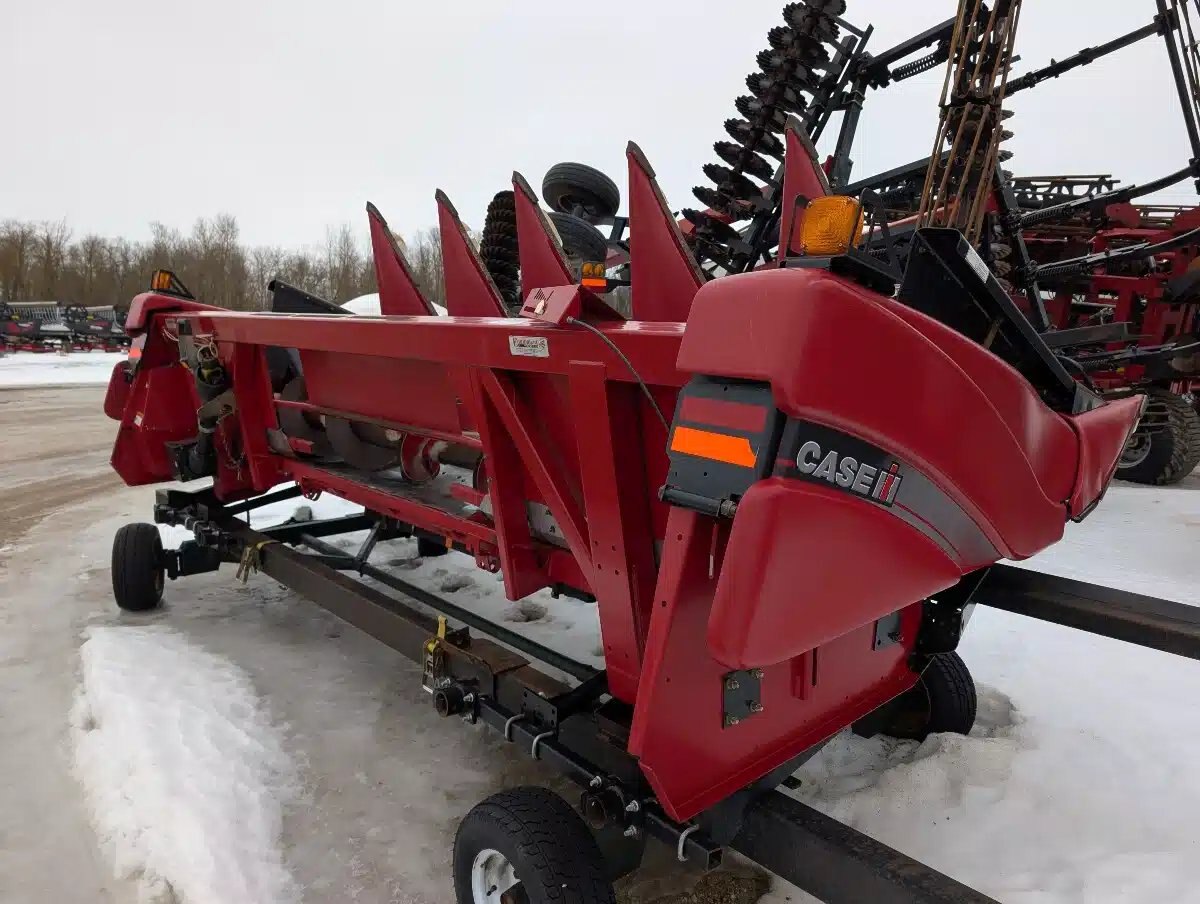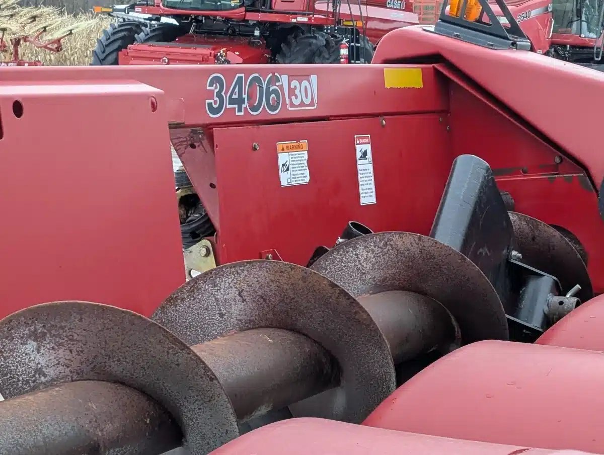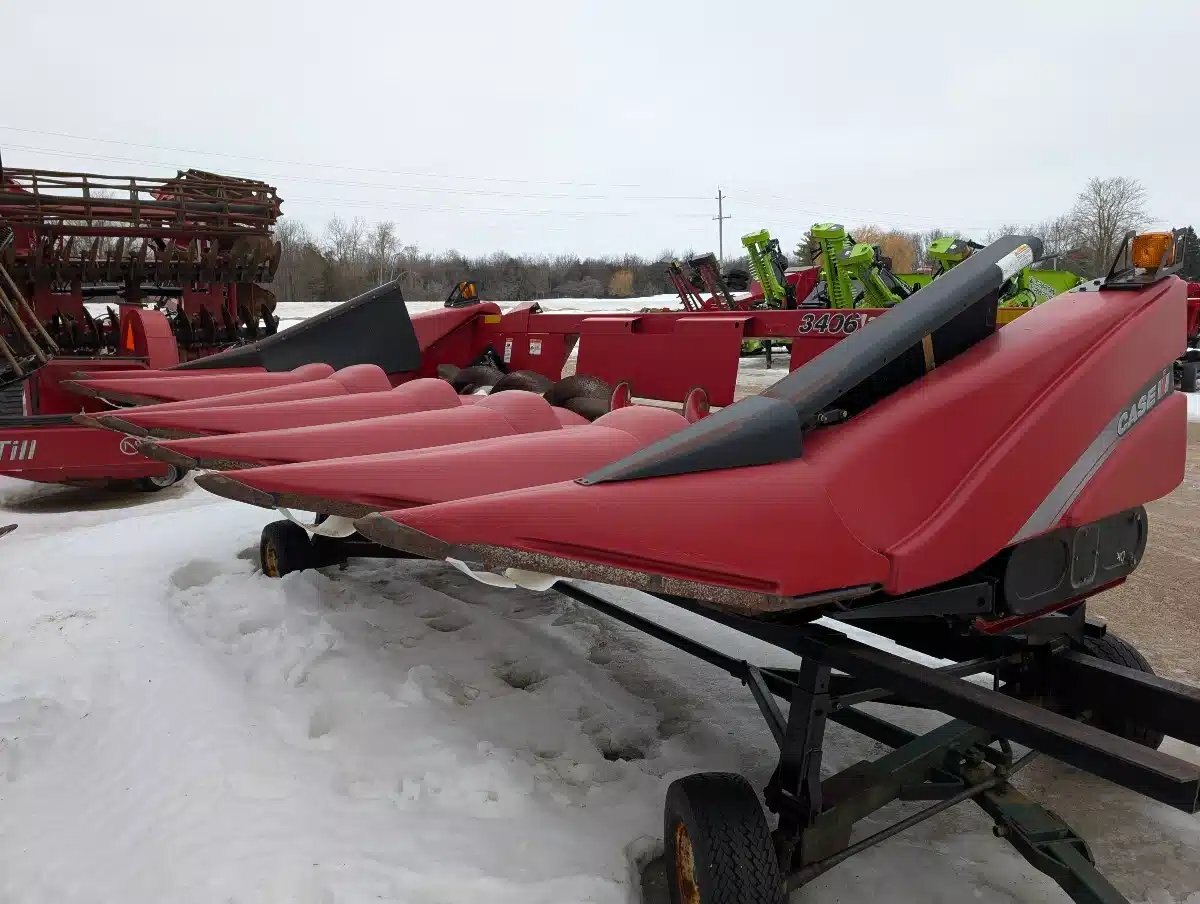 2010 Case IH 3406 Corn Head. 6 Row Unit on 30" Centers, Hydraulic Deck Plates, Ear Savers, Single Point Hook Up, Small 1000 pto and New Calmer Rolls, Chain & Sprockets. Includes 6 Stalk Stompers. No Auto Header Height Controls. Header Carts Available but not Included.